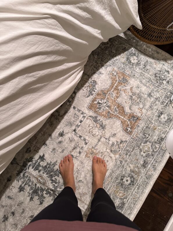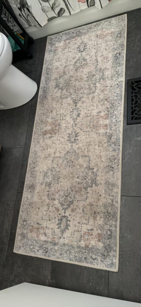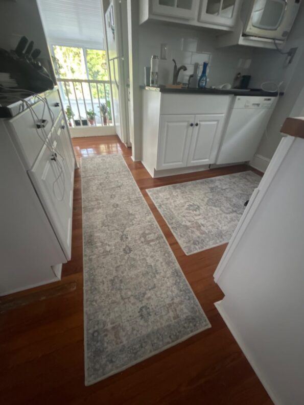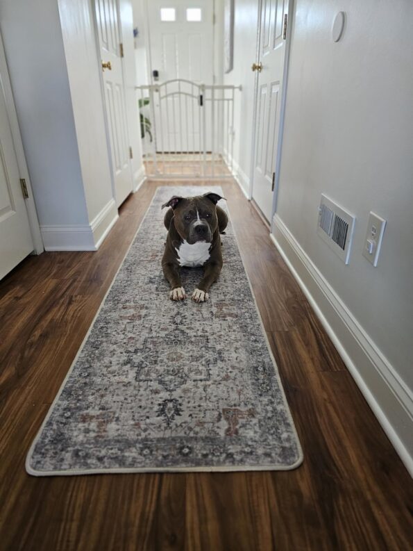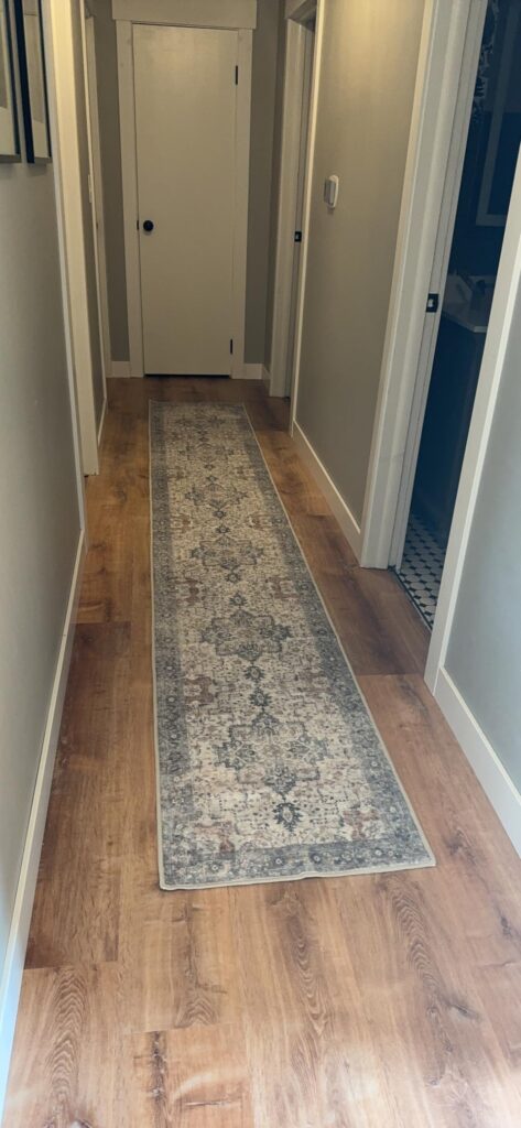 I don’t know why it took me so long to purchase this rug, because it’s absolutely beautiful. It alone transformed my hallway and brightened it up. It comes with adhesive to help it lay flat. I did use some additional carpet adhesive because after a while the edges begin to curl up, but carpet adhesive keeps it flat. It’s very lightweight and I’m even able to throw it in the wash if the kids or baby dog dirty it somehow.